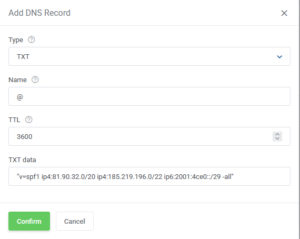 Dieser neue Eintrag bedeutet für die empfangenden Mail Server, dass E-Mails die unter Ihrem Domainnamen gesendet werden, von einem Mailserver kommen, der entweder mit der IP-Adresse aus dem Netz 81.90.32.0/20, 185.219.196.0/22 oder 2001:4ce0::/29 arbeitet. Sofern Sie E-Mails von anderen Servern oder auch über andere Server versenden, müssen Sie hier andere bzw. zusätzliche IP-Adressen eintragen. Die genaue Syntax finden Sie unter https://de.wikipedia.org/wiki/Sender_Policy_Framework.