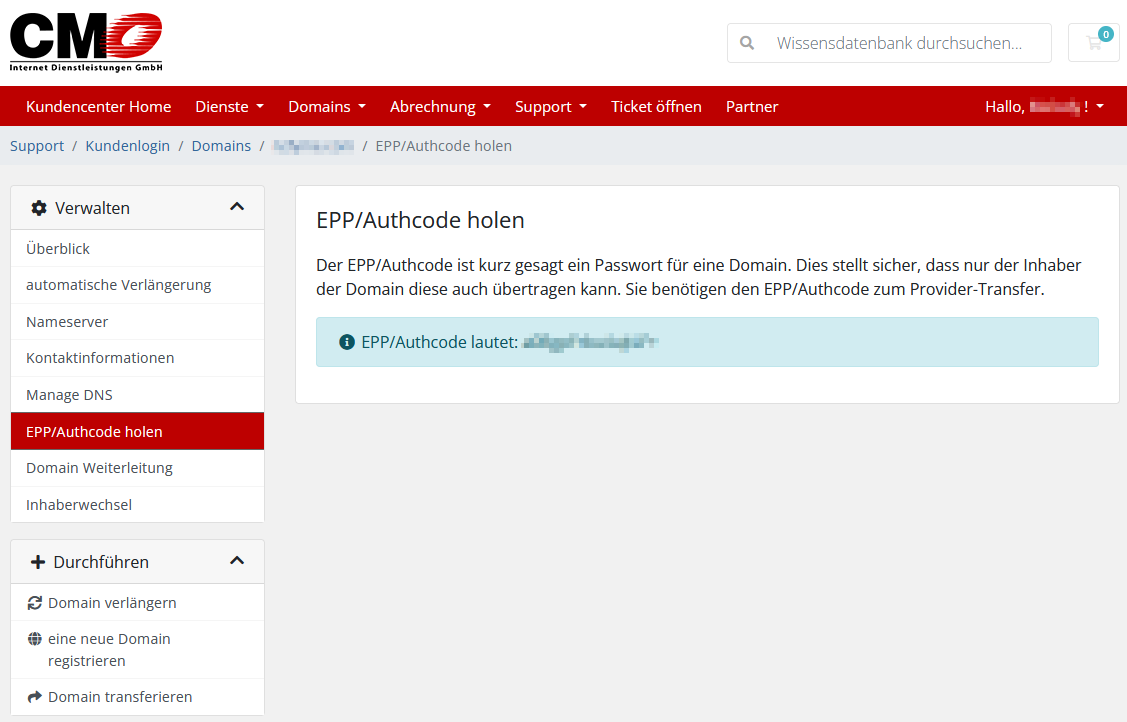 8. Sofern Ihr Tarif eine Domain enthält, können Sie dann ab Erhalt dieser Kündigungsbetätigung, wenn nötig einen Auth-Code über das Kundencenter anfordern